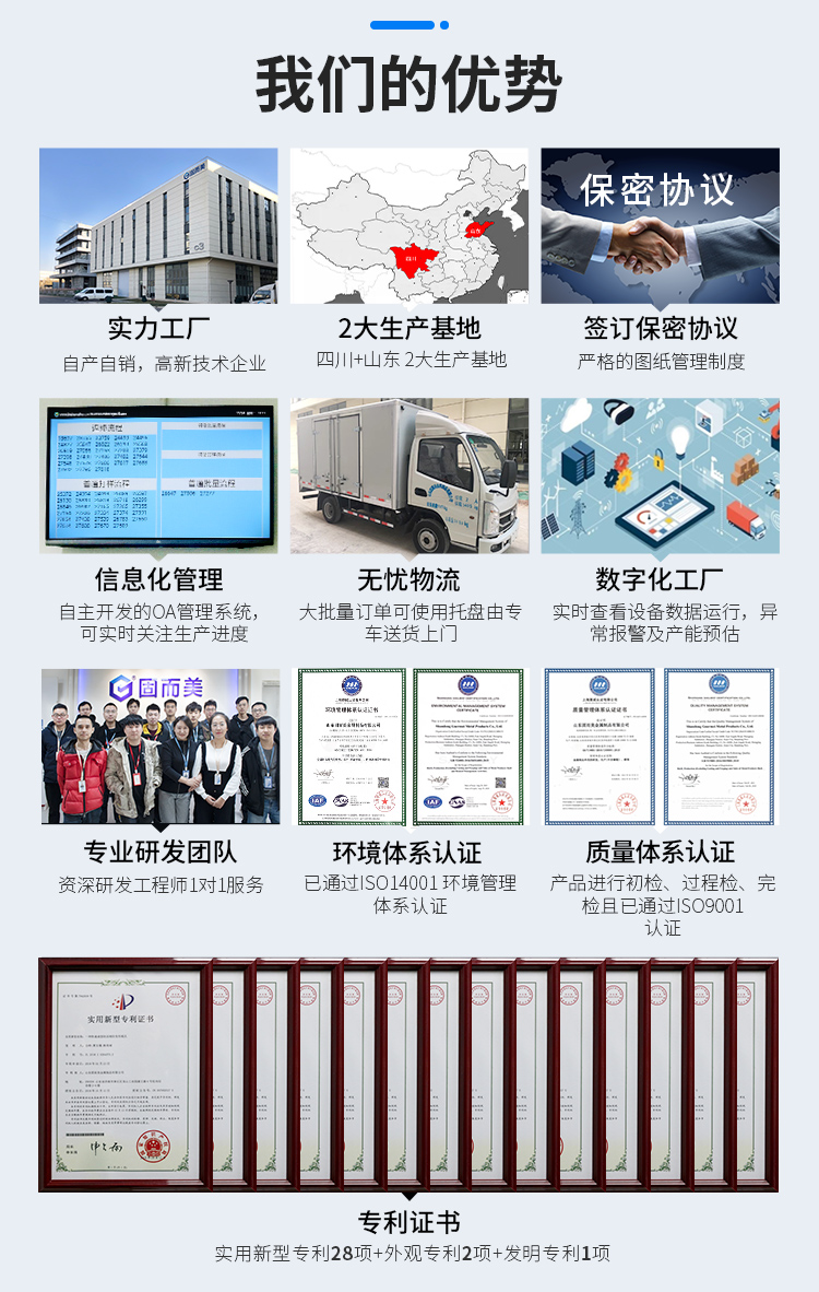 公司有專業的設計團隊,獲得國家專利共31項,實用新型專利28項,外觀專利2項,發明專利1項,產品均通過ISO9001質量體系認證和ISO14001環境管理體系認證,有成熟完善的生產線,作為專業的鈑金加工廠,企業有三萬件產品的研發經驗。廠家有專業技術工人,含過程檢和完檢兩道質檢工序,歡迎各位廠家、客戶來圖或來樣定制產品。